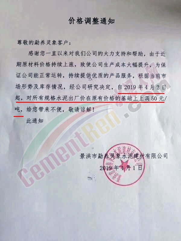 唐山金馬啟新水泥有限公司價(jià)格調(diào)整告知函稱,因近期采取提高汽車排放標(biāo)準(zhǔn),加大貨運(yùn)車輛治理力度,對(duì)環(huán)保及相關(guān)企業(yè)不斷實(shí)行錯(cuò)峰生產(chǎn),限產(chǎn),停產(chǎn)等措施。隨著國(guó)家環(huán)保壓力不斷加大,水泥生產(chǎn)成本和運(yùn)輸成本不斷上升及水泥行情變化,金馬啟新水泥的價(jià)格進(jìn)行調(diào)整,具體調(diào)整如下:自2019年4月1日早0時(shí)起,所有水泥價(jià)格上調(diào)40元/噸。
