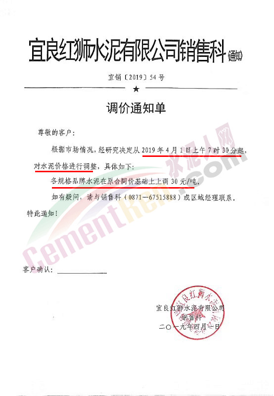 云南區(qū)域宜良紅獅水泥有限公司銷售科調(diào)價(jià)通知稱,自4月1日上午7時(shí)30分起,對(duì)水泥價(jià)格進(jìn)行調(diào)整:各規(guī)格品牌水泥在原合同價(jià)基礎(chǔ)上上調(diào)30元/噸。