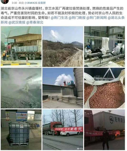 同一日來自于新浪微博的一條消息稱,湖北省京山市永興鎮(zhèn)盤堰村,京蘭水泥廠再建垃圾焚燒處理,燃燒的危廢品產(chǎn)生的毒氣,嚴(yán)重危害到村民的生命。如若不能及時積極的處理,勢必對京山市人民的生命造成不可估量的影響,望幫助。