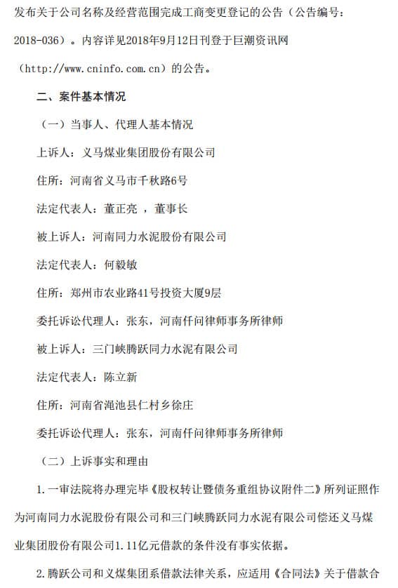 2018年7月,義煤集團(tuán)訴河南同力水泥股份有限公司和三門(mén)峽騰躍同力水泥有限公司合同糾紛一案由河南省鄭州市中級(jí)人民法院立案受理。鄭州中級(jí)人民法院判決河南同力水泥股份有限公司在三方配合完成本判決第一項(xiàng)所列證照辦理完畢后30日內(nèi),向三門(mén)峽騰躍同力水泥有限公司提供1.11億元資金,由三門(mén)峽騰躍同力水泥有限公司用于償還其對(duì)義煤集團(tuán)的債務(wù)。同時(shí)鄭州中級(jí)人民法院判決案件受理費(fèi)由義馬煤業(yè)集團(tuán)股份有限公司負(fù)擔(dān)和河南同力水泥股份有限公司共同負(fù)擔(dān)。公告原文如下: