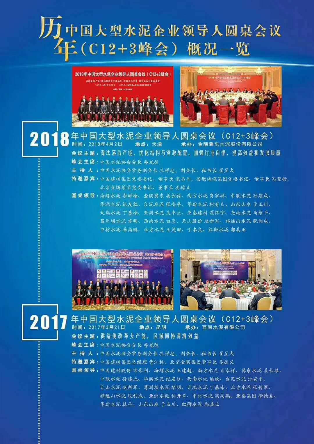 據(jù)水泥人網(wǎng)了解,中國(guó)大型水泥企業(yè)領(lǐng)導(dǎo)人圓桌會(huì)議(C12+3峰會(huì))自2012年以來(lái)每年一屆,通常在每年的三月或四月份召開(kāi)。