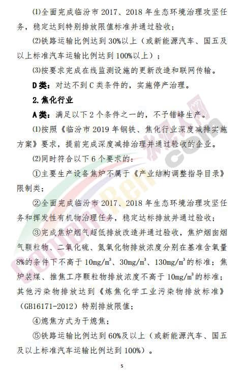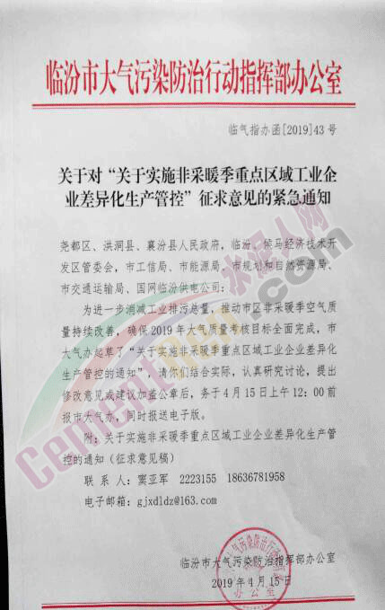 日前,山西臨汾市下達(dá)非采暖季重點區(qū)域差異化生產(chǎn)管控的通知,從2019年4月15日起,到2019年9月30日止,對一城三區(qū)(堯都區(qū)、襄汾縣、洪洞縣,臨汾開發(fā)區(qū))相關(guān)企業(yè)實施差異化生產(chǎn)管控。嚴(yán)格對照臨發(fā)[2017]3號文件, 臨發(fā)[2018]2號文件,焦化、鋼鐵、洗煤、鑄造、磚瓦、混凝土攪拌等行業(yè)環(huán)保整治方案和《臨汾市2018年重點行業(yè)揮發(fā)性有機物(VOCs)污染防治工作方案》。重點對鋼鐵(含連鑄和鐵合金)、焦化、水泥(不含粉磨站)、鑄造其他涉VOCs行業(yè)分類實施差別化管控。
