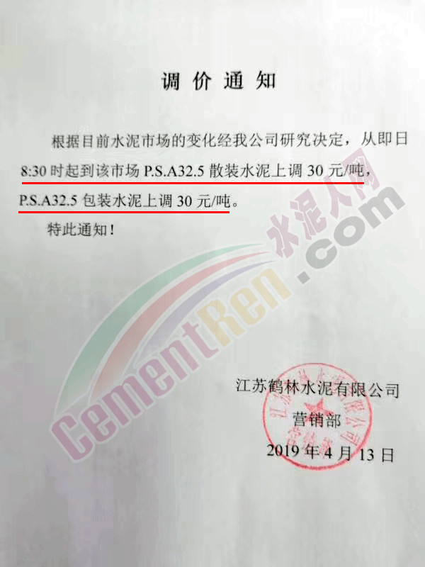 尊敬的客戶:您好!根據(jù)當(dāng)前市場行情,我公司于2019年4月13日8:00,對各品種水泥價格上調(diào)30元/噸。特此通知!
