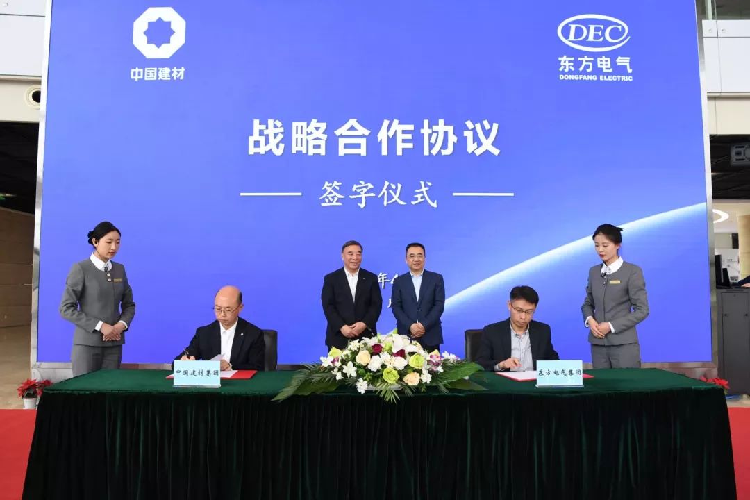 中國建材集團(tuán)總經(jīng)理助理兼董事會(huì)秘書光照宇、總經(jīng)理助理兼投資發(fā)展部總經(jīng)理魏如山,中國建材股份總裁兼凱盛科技總經(jīng)理彭壽,集團(tuán)董事會(huì)辦公室、企業(yè)管理部,凱盛科技、西南水泥、中國巨石、中復(fù)連眾、中材科技、中建材信息新能源有關(guān)負(fù)責(zé)人,東方電氣集團(tuán)規(guī)劃發(fā)展部、市場部、中央研究院、可再生能源與新材料事業(yè)部、東方電機(jī)、東方汽輪機(jī)、東方鍋爐、東方風(fēng)電、東方國際、峨半所、東樹新材有關(guān)負(fù)責(zé)人參加簽字儀式。