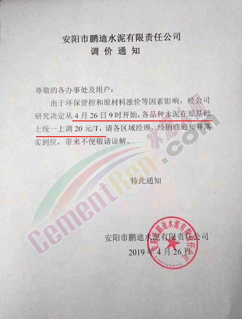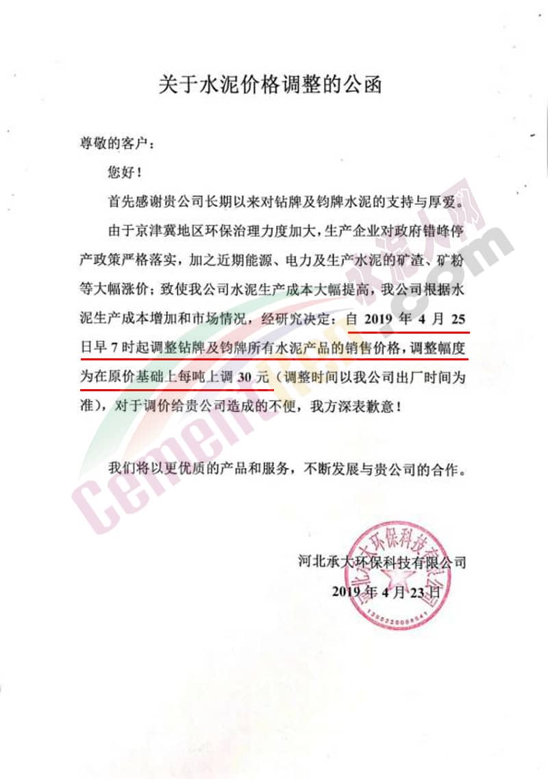 河北承大環(huán)保科技有限公司水泥價(jià)格調(diào)整公函稱,由于京津冀地區(qū)環(huán)保治理力度加大,生產(chǎn)企業(yè)對(duì)政府錯(cuò)峰停產(chǎn)政策嚴(yán)格落實(shí),加之近期能源、電力及生產(chǎn)水泥的礦渣、礦粉等大幅漲價(jià);致使公司水泥生產(chǎn)成本大幅提高,公司根據(jù)水泥生產(chǎn)成本增加和市場(chǎng)情況,經(jīng)研究決定自4月25日早7時(shí)起調(diào)整鉆牌及鈞牌所有水泥產(chǎn)品的銷售價(jià)格,調(diào)整幅度為在原價(jià)基礎(chǔ)上每噸上調(diào)30元。