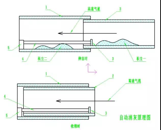 為了避免水平伸縮風管積塵堵塞,在伸縮風管內(nèi)安裝了自動清理積灰的機構(gòu)(專利產(chǎn)品,專利號:201520424899.X;),可以保證水平風管長期穩(wěn)定的使用。