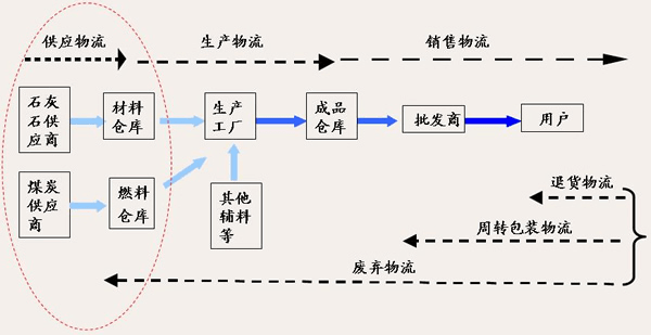 水泥行業(yè)的物流按業(yè)務環(huán)節(jié)產(chǎn)生先后順序分為供應物流、生產(chǎn)物流和銷售物流三部分,如圖1,其中供應物流和銷售物流對水泥企業(yè)的影響最大。