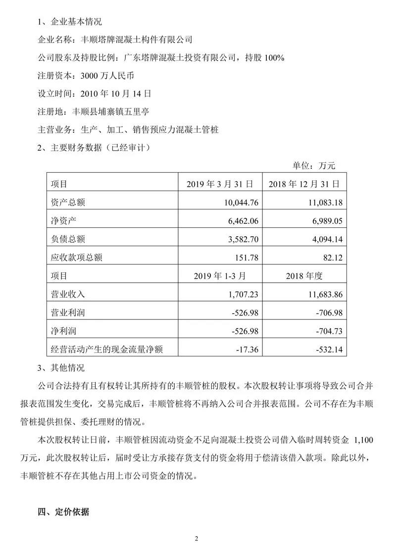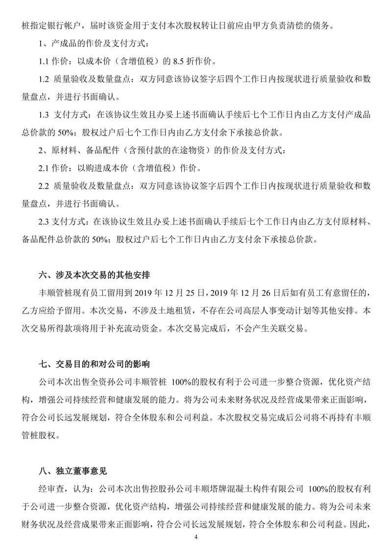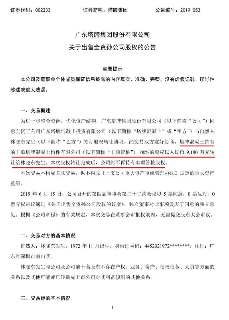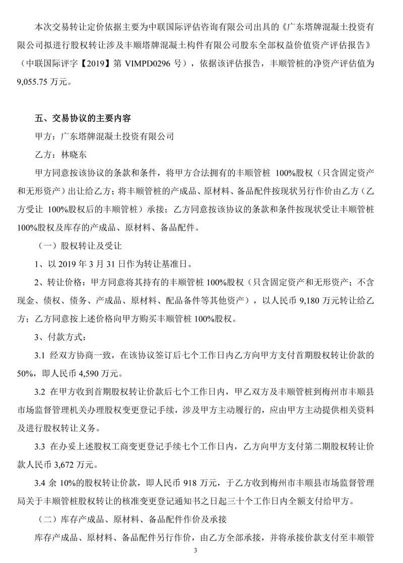 塔牌集團(tuán)公告披露,為進(jìn)一步整合資源,優(yōu)化資產(chǎn)結(jié)構(gòu),公司同意全資子公司廣東塔牌混凝土投資有限公司與自然人林曉東先生簽訂股權(quán)轉(zhuǎn)讓協(xié)議,經(jīng)交易雙方友好協(xié)商,塔牌混凝土持有的豐順?biāo)苹炷翗?gòu)件有限公司100%的股權(quán)以人民幣9,180萬(wàn)元轉(zhuǎn)讓給林曉東先生。本次股權(quán)轉(zhuǎn)讓完成后,公司將不再持有豐順管樁股權(quán)。