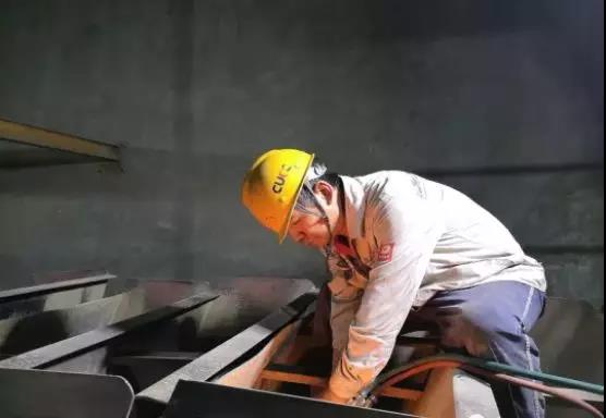 熟料車(chē)間維修工曾慶雨和巡檢工曹東閣正在2號(hào)窯熟料拉鏈機(jī)對(duì)料斗進(jìn)行檢查,更換磨損嚴(yán)重的料斗螺栓。
