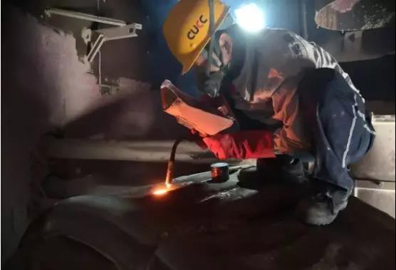 在2號(hào)生料立磨,機(jī)電車(chē)間維修班長(zhǎng)宋新奇正在對(duì)磨輥進(jìn)行手工堆焊,為節(jié)省檢修時(shí)間,提高效率,他和田強(qiáng)兩人換班作業(yè)。