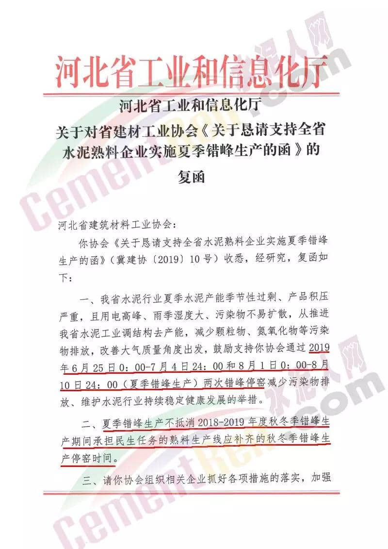水泥人網(wǎng)通訊員消息:日前,河北省工業(yè)和信息化廳復(fù)函給河北省建筑材料工業(yè)協(xié)會稱:河北省建材工業(yè)協(xié)會《關(guān)于懇請支持全省水泥熟料企業(yè)實(shí)施夏季錯峰生產(chǎn)的函》(冀建協(xié)【2019】10號)已收到,經(jīng)研究做出回復(fù)。主要內(nèi)容為鼓勵支持協(xié)會通過夏季兩次錯峰停窯減少污染物排放、維護(hù)水泥行業(yè)持續(xù)穩(wěn)定健康發(fā)展的舉措。