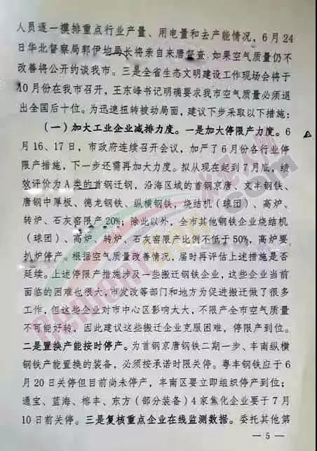 下一步,唐山市將加大工業(yè)企業(yè)減排力度。首先,加大停限產(chǎn)力度。擬從現(xiàn)在起到7月底,績效評價為A類的首鋼遷鋼,沿海區(qū)域的首鋼京唐、文豐鋼鐵、唐鋼中厚板、德龍鋼鐵、縱橫鋼鐵、燒結機(球團)、高爐、轉爐、石灰窯限產(chǎn)20%;除此以外,全是其他鋼鐵企業(yè)燒結機(球團)、高爐、轉爐、石灰窯限產(chǎn)比例不低于50%,高爐要扒爐停產(chǎn)。其次,置換產(chǎn)能按時停產(chǎn)。第三,復核重點企業(yè)在線監(jiān)測數(shù)據(jù)。文件原文如下: