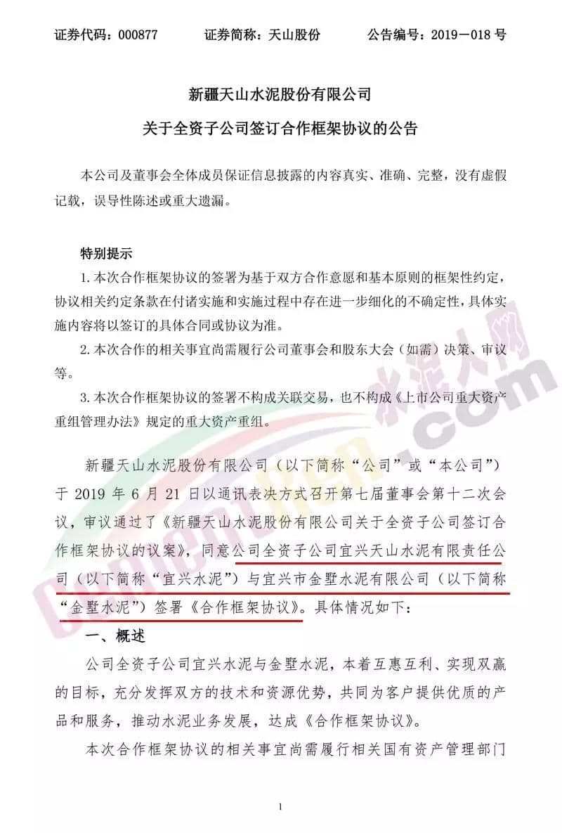 公告稱(chēng):新疆天山水泥股份有限公司于 2019 年 6 月 21 日以通訊表決方式召開(kāi)第七屆董事會(huì)第十二次會(huì)議,審議通過(guò)了《新疆天山水泥股份有限公司關(guān)于全資子公司簽訂合作框架協(xié)議的議案》,同意公司全資子公司宜興天山水泥有限責(zé)任公司(以下簡(jiǎn)稱(chēng)“宜興水泥”)與宜興市金墅水泥有限公司(以下簡(jiǎn)稱(chēng)“金墅水泥”)簽署《合作框架協(xié)議》。