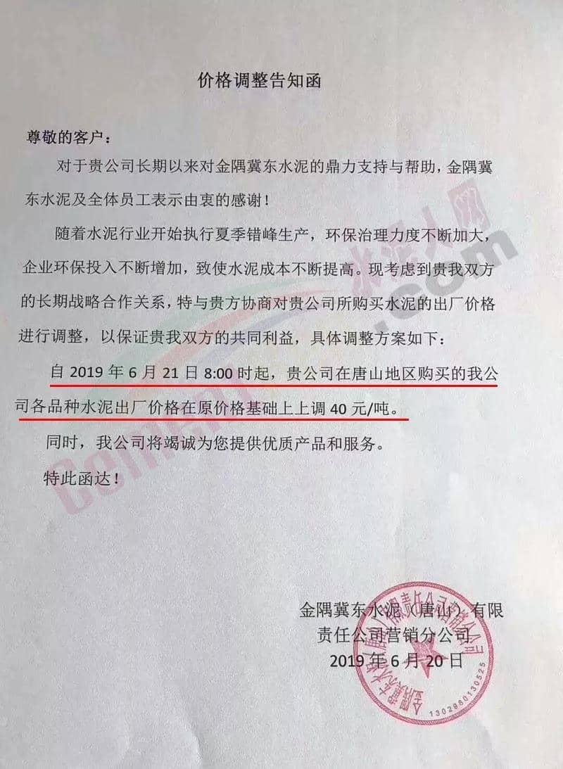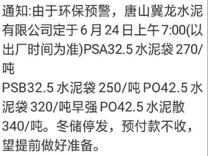 冀東水泥唐山公司等主導企業(yè)發(fā)布調價通知稱:隨著水泥行業(yè)開始執(zhí)行夏季錯峰生產(chǎn),環(huán)保治理力度不斷加大,企業(yè)環(huán)保投入不斷增加,致使水泥成本不斷提高。特與客戶協(xié)商對其購買水泥的出廠價格進行調整,以保證雙方共同利益。自6月21日8時起,在唐山地區(qū)購買的各品種水泥出廠價在原價格基礎上上調20-40元/噸。