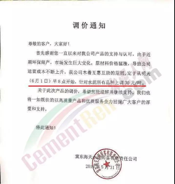 6月1日冀東海天聞喜上調水泥價格30元/噸。