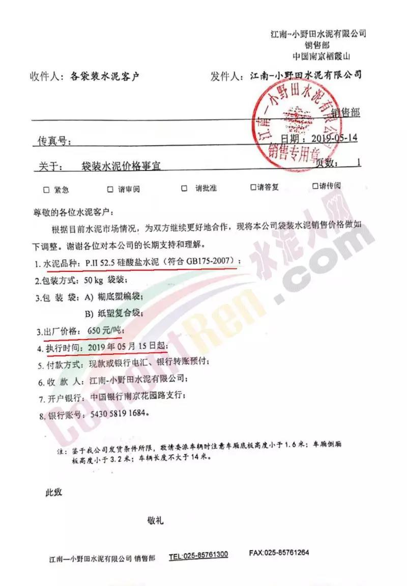 2019年05月15日江蘇省南京市的江南一小野田水泥對包裝水泥價格上調50元/噸,調整后廠內裝車價650元/噸!
