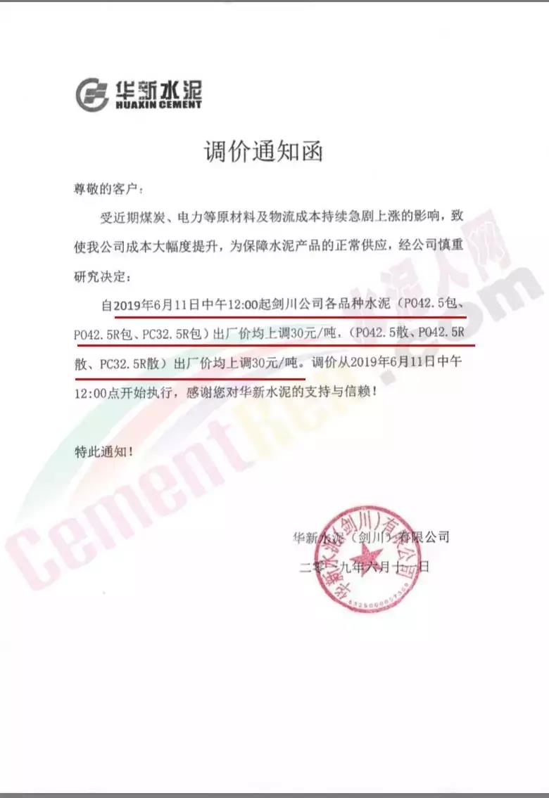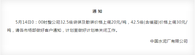 同期,區(qū)域內中聯(lián)水泥及海螺水泥全資子公司中國水泥廠也發(fā)布了調價通知。