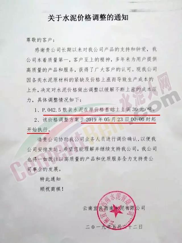 5月24日云南華新東駿水泥有限公司42.5散裝水泥上調30元/噸。