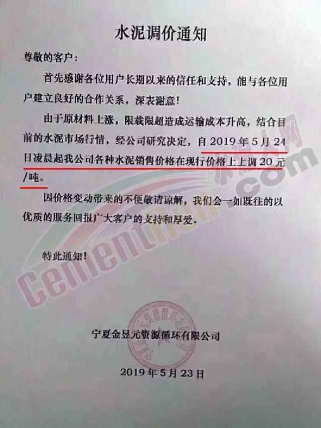 水泥大省河南地區(qū),自5月1日以來,同力水泥、孟電水泥、天瑞水泥、春江水泥等20多家水泥企業(yè)宣布漲價,單次漲價幅度在30元/噸左右。部分漲價通知如下: