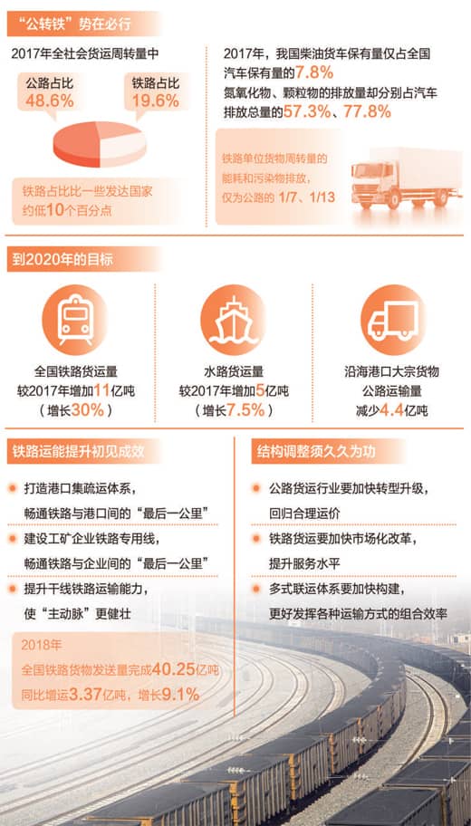 去年9月,國務(wù)院辦公廳正式印發(fā)《推進運輸結(jié)構(gòu)調(diào)整三年行動計劃(2018—2020年)》(簡稱“行動計劃”),提出了明確的任務(wù)與目標——任務(wù)涵蓋鐵路運能提升、公路貨運治理、多式聯(lián)運提速等“六大行動”;目標則是以大宗貨物運輸“公轉(zhuǎn)鐵、公轉(zhuǎn)水”為主攻方向,通過三年集中攻堅,實現(xiàn)全國鐵路貨運量較2017年增加11億噸(增長30%)、水路貨運量較2017年增加5億噸(增長7.5%)、沿海港口大宗貨物公路運輸量減少4.4億噸。為此,交通運輸部會同鐵路、民航等部門成立了運輸結(jié)構(gòu)調(diào)整工作組,合力推動此項工作。
