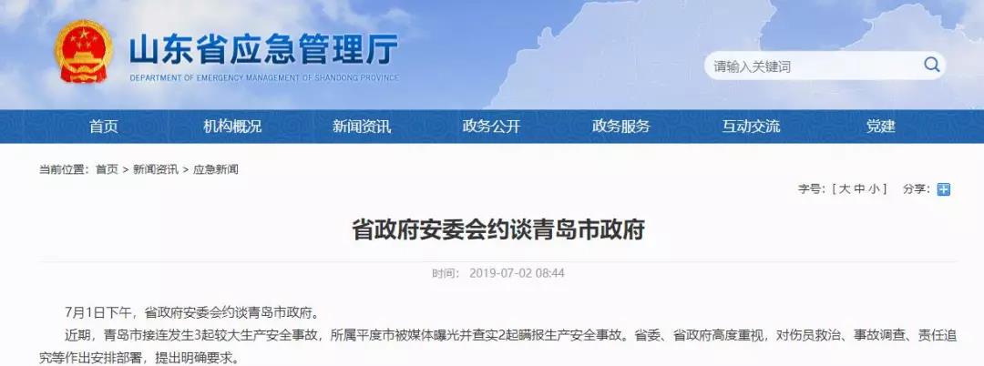7月1日下午,山東省政府安全生產(chǎn)委員會(huì)召開(kāi)安全生產(chǎn)約談會(huì),因近期青島連續(xù)發(fā)生3起較大事故,青島市政府在此次會(huì)議上被約談。