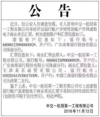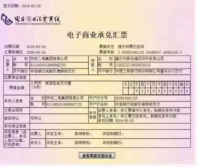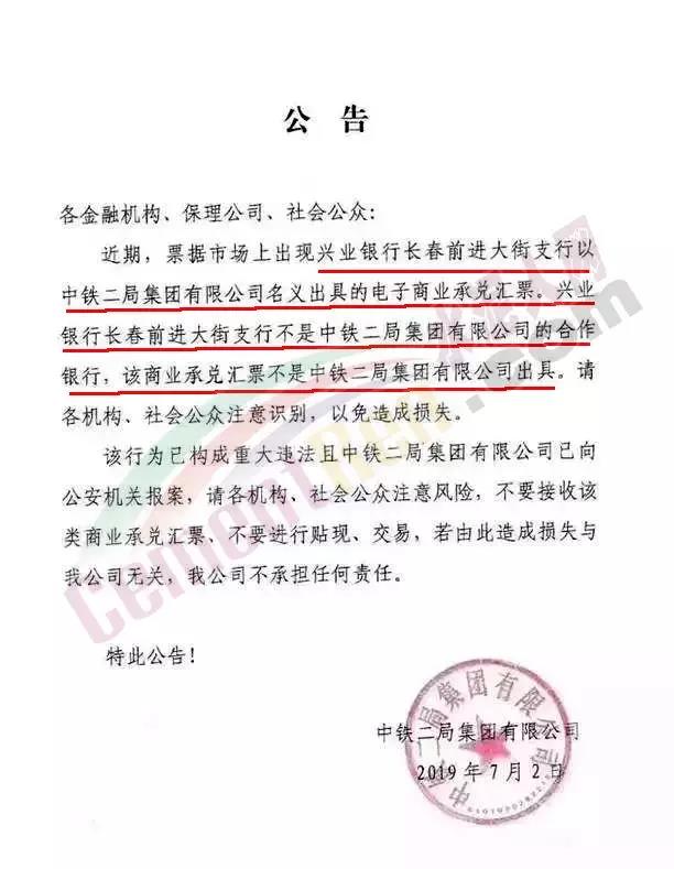 并且中鐵二局公司已經(jīng)向公安機關(guān)報案,請各機構(gòu)、社會公眾注意風(fēng)險,不要接收該類商業(yè)承兌匯票、不要進行貼現(xiàn)、交易,造成的損失中鐵二局不承擔(dān)責(zé)任。 說白了這票和中鐵二局沒有關(guān)系,到期可能無法兌付。