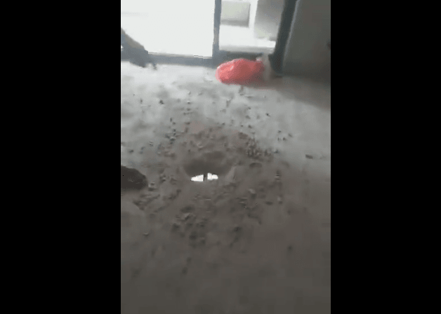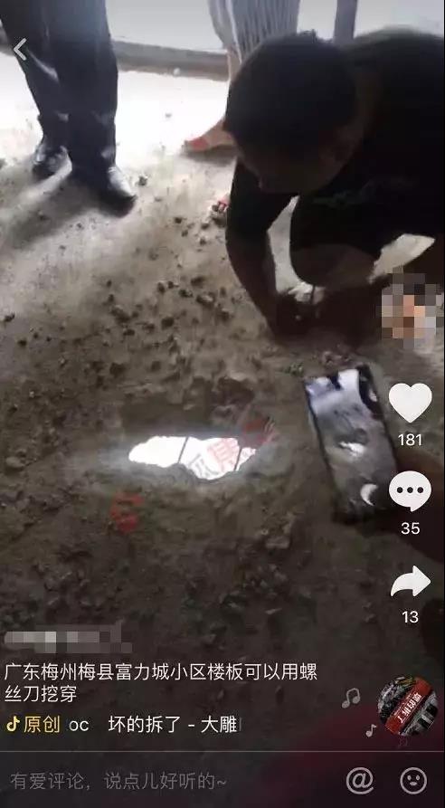 從視頻中可見,該事件發(fā)生在梅州富力城第4期22棟803號房,業(yè)主僅用一把螺絲刀便可以輕松刮開地板上的水泥,捅出一個(gè)窟窿,水泥毫無強(qiáng)度、韌性、穩(wěn)定性可言,鋼筋也是相當(dāng)細(xì),根本無法想象這可以保證樓上、樓下兩家人的日常生活安全。
