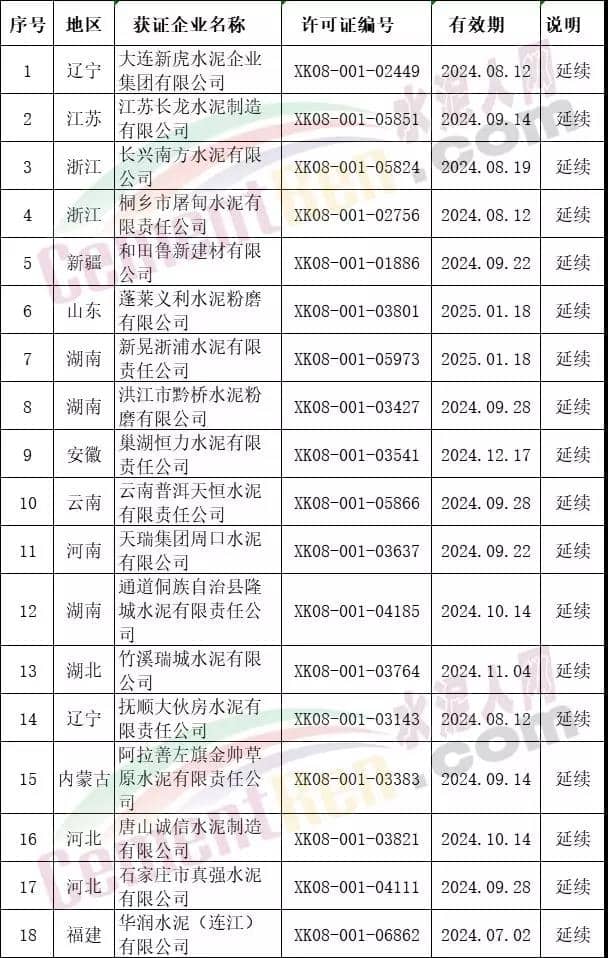 七月第一批發(fā)放證書(shū)涉及許可范圍、項(xiàng)目名稱(chēng)變更的共12個(gè)編號(hào),其中包括石家莊市曲寨水泥有限公司、葛洲壩石門(mén)特種水泥有限公司、都江堰拉法基水泥有限公司等多家生產(chǎn)特種水泥及通用52.5水泥產(chǎn)品的全能水泥廠(chǎng);涉及生產(chǎn)許可證到期延續(xù)的企業(yè)共計(jì)18個(gè)編號(hào)。