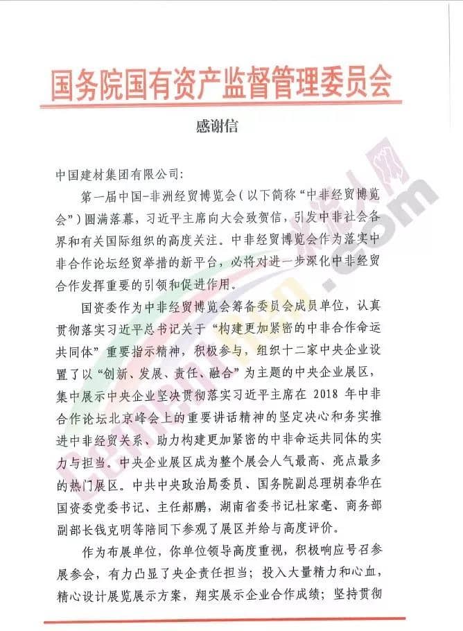 日前,國務(wù)院國有資產(chǎn)監(jiān)督管理委員會發(fā)感謝信給中國建材集團有限公司稱:作為中非經(jīng)貿(mào)博覽會布展單位 ,中國建材集團領(lǐng)導(dǎo)高度重視,積極響應(yīng)號召參展參會,有力凸顯了央企責任擔當;投入大量精力和心血精心設(shè)計展覽展示方寧,翔實展示企業(yè)合作成績;堅持貫徹落實中央八項規(guī)定精神,做到了節(jié)儉、務(wù)實、高效;協(xié)調(diào)配合,有序組織 ,積極參加相關(guān)活動,烘托了大會氛圍;大力宣傳報道,展示了央企開放合作良好形象。感謝信原文如下: