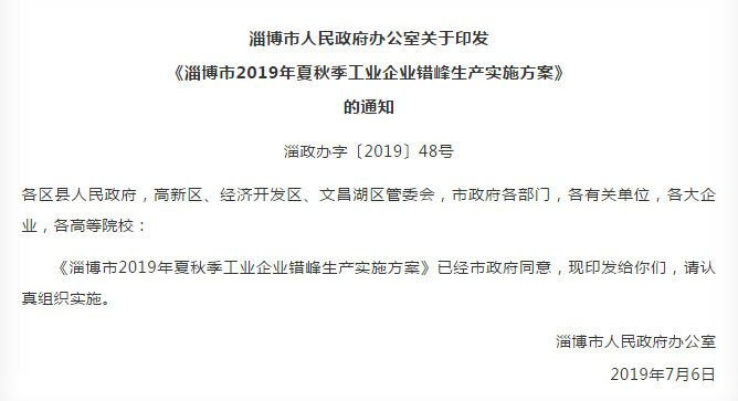 (五)水泥(不含粉磨站)。以山東省水泥行業(yè)協(xié)會(huì)《關(guān)于支持組織山東省水泥企業(yè)熟料生產(chǎn)線實(shí)施夏季錯(cuò)峰生產(chǎn)的函》(魯水協(xié)字〔2019〕05號(hào))文件中規(guī)定的停產(chǎn)時(shí)間為準(zhǔn),協(xié)同處理固廢或危廢的企業(yè)應(yīng)當(dāng)按照停產(chǎn)時(shí)間要求,核算限產(chǎn)比例和實(shí)際產(chǎn)量。停產(chǎn)時(shí)間為8月17日—9月5日,時(shí)間20天。前期6月1日-20日,未落實(shí)錯(cuò)峰要求的,需在本方案規(guī)定的夏秋季錯(cuò)峰期間一并補(bǔ)齊。