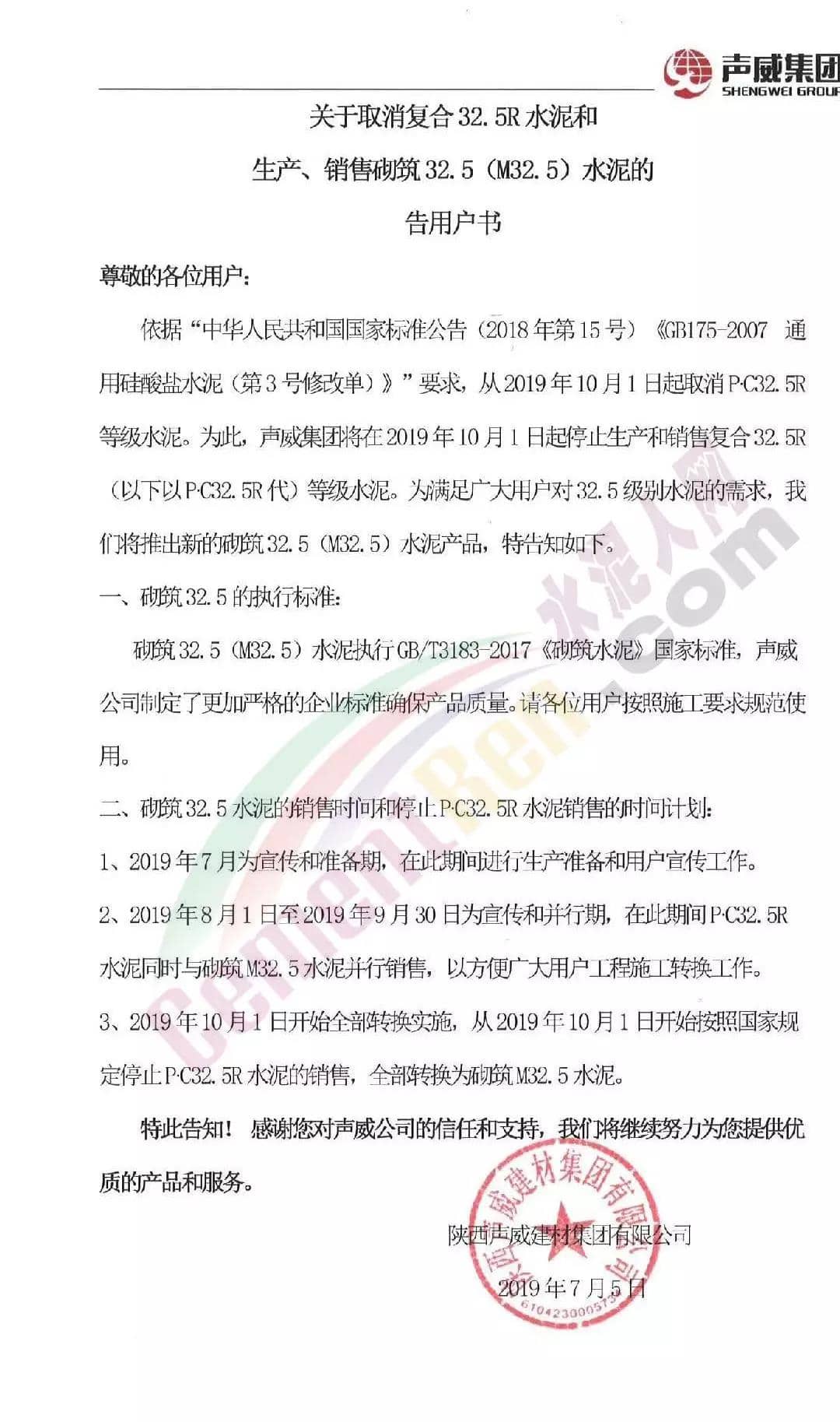 無獨(dú)有偶,此前陜西聲威建材集團(tuán)有限公司也曾發(fā)布《關(guān)于取消復(fù)合32.5R水泥和生產(chǎn)、銷售砌筑32.5(M32.5)水泥的告用戶書》。