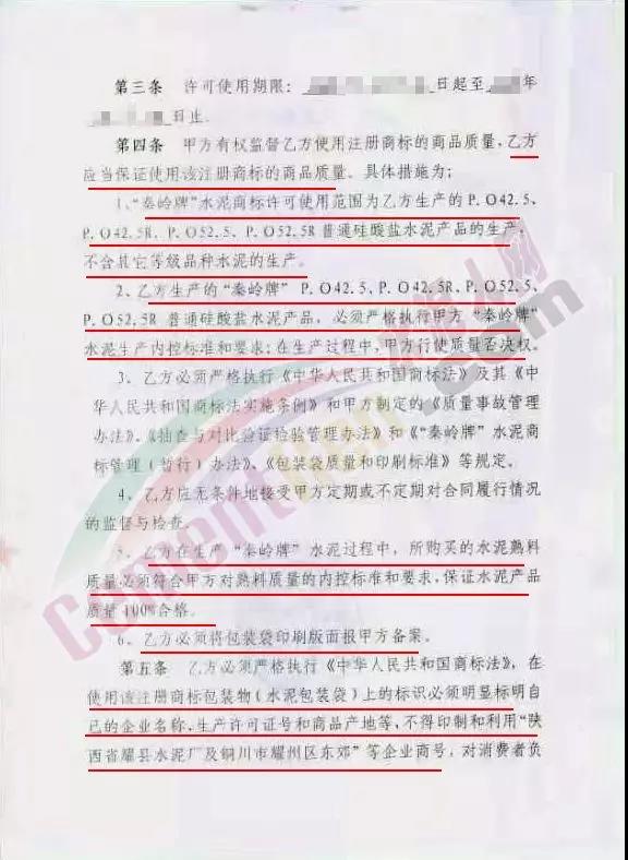 據(jù)水泥人網(wǎng)了解,其品牌授權(quán)生產(chǎn)經(jīng)營(yíng)協(xié)議中有明確質(zhì)量及品牌使用要求。商標(biāo)使用者應(yīng)保證使用該注冊(cè)商標(biāo)的商品質(zhì)量,具體措施為:“秦嶺牌”水泥商標(biāo)許可使用范圍為商標(biāo)使用者生產(chǎn)的各標(biāo)號(hào)普通硅酸鹽水泥產(chǎn)品;商標(biāo)使用者生產(chǎn)的“秦嶺牌”各標(biāo)號(hào)水泥,必須嚴(yán)格執(zhí)行商標(biāo)使用者“秦嶺牌”水泥生產(chǎn)內(nèi)控標(biāo)準(zhǔn)和要求。在生產(chǎn)過(guò)程中,耀縣水泥廠行使質(zhì)量否決權(quán);商標(biāo)使用者在生產(chǎn)“秦嶺牌”水泥的過(guò)程中,所購(gòu)買的水泥熟料質(zhì)量必須符合耀縣水泥廠對(duì)熟料質(zhì)量的內(nèi)控標(biāo)準(zhǔn)和要求,保證水泥產(chǎn)品質(zhì)量100%合格。