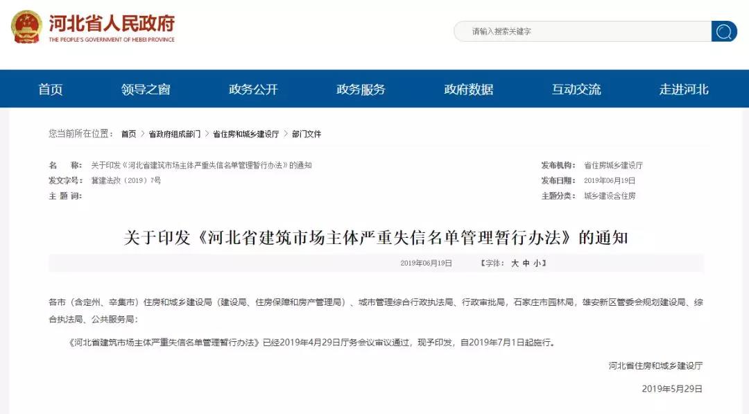 5月29日,河北省住建廳印發(fā)《河北省建筑市場主體嚴(yán)重失信名單管理暫行辦法》,《辦法》自2019年7月1日起施行,有效期1年。
