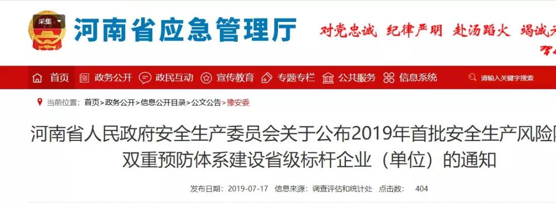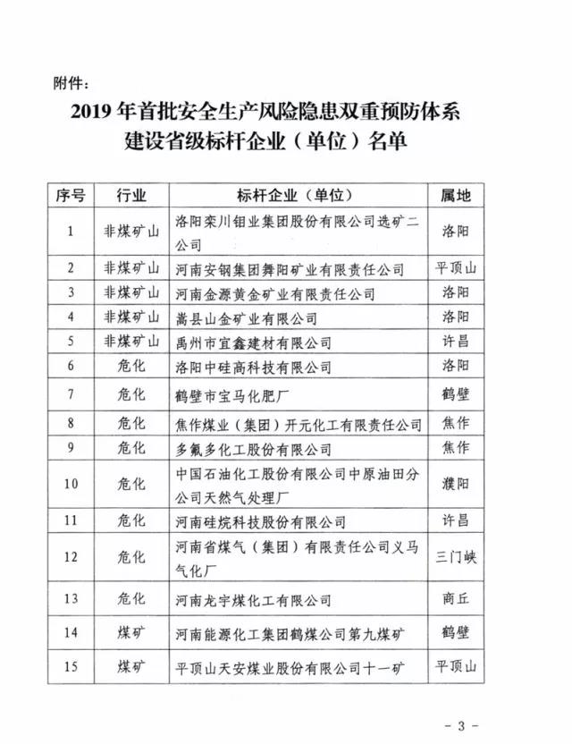 河南省應(yīng)急管理廳官網(wǎng)發(fā)布的豫安委【2019】7號(hào)文顯示,河南省煤氣集團(tuán)公司義馬氣化廠名列河南省“2019年首批安全生產(chǎn)風(fēng)險(xiǎn)隱患雙重預(yù)防體系建設(shè)省級(jí)標(biāo)桿企業(yè)”,是河南省內(nèi)72家企業(yè)(單位)之一。文件發(fā)布日期為今年7月9日。