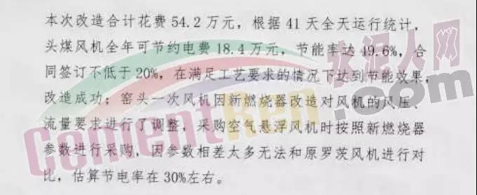 2、窯頭空氣懸浮風(fēng)機(jī):因燃燒器改造后風(fēng)壓要求高于原燃燒器一倍,訂購空氣懸浮風(fēng)機(jī)時(shí)按照新燃燒器設(shè)計(jì)參數(shù)采購,對(duì)比實(shí)際參數(shù)做功時(shí)按照空氣懸浮風(fēng)機(jī)風(fēng)壓、流量接近于原羅茨風(fēng)機(jī)進(jìn)行,上圖中標(biāo)黃數(shù)據(jù)為接近原羅茨風(fēng)機(jī)的參數(shù)和用電量;根據(jù)對(duì)比節(jié)電率為30.5%,達(dá)到合同簽訂要求。