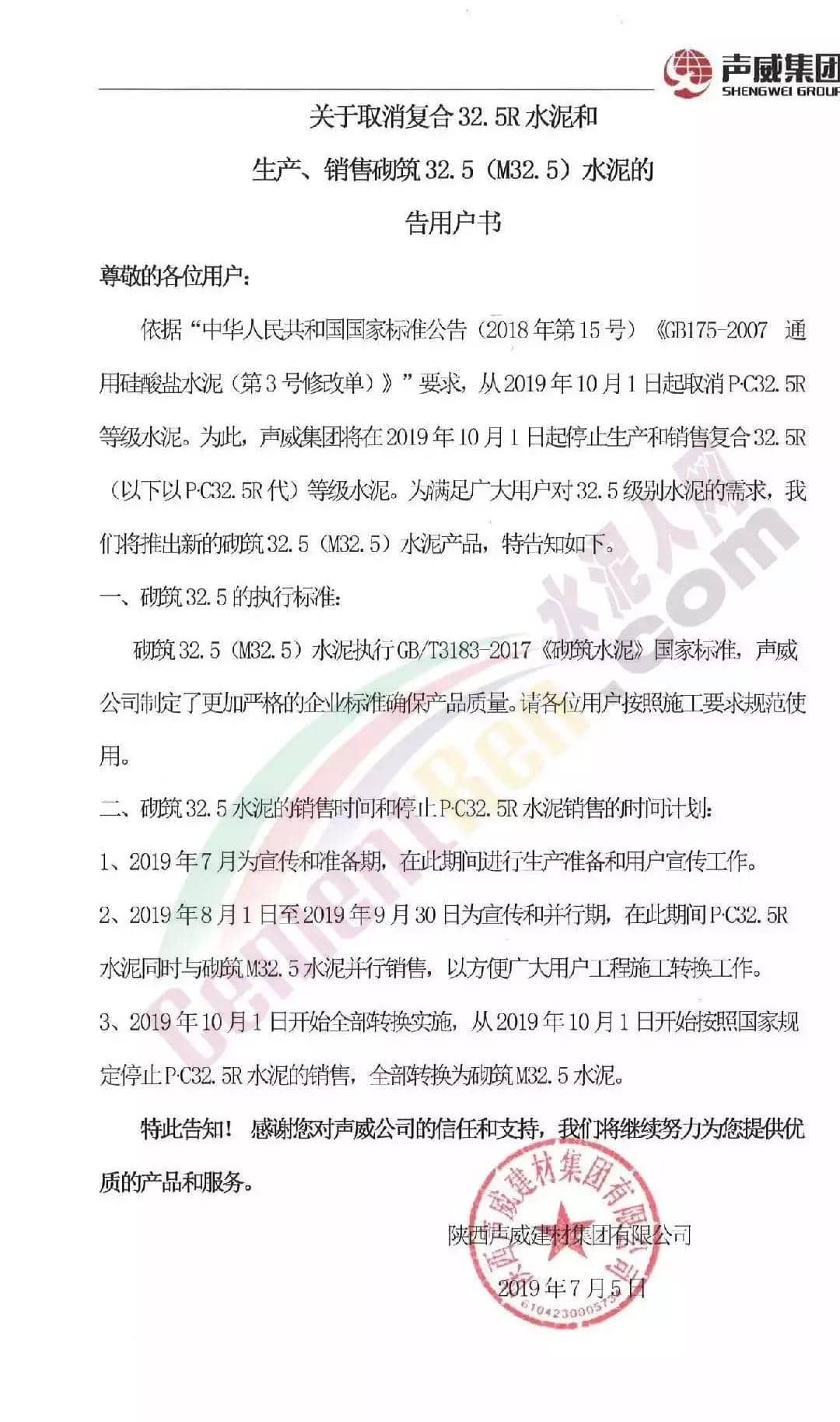 月初陜西聲威建材集團有限公司首先發(fā)布《關(guān)于取消復(fù)合32.5R水泥和生產(chǎn)、銷售砌筑32.5(M32.5)水泥的告用戶書》。