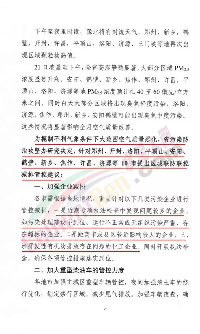同日,輝縣市環(huán)境污染防治攻堅指揮部發(fā)布《關(guān)于應(yīng)對高濕靜穩(wěn)天氣的管理通知》稱,根據(jù)河南省污染防治攻堅領(lǐng)導(dǎo)小組辦公室文件要求及新鄉(xiāng)市緊急會議精神,為扼制不利氣象條件下大范圍空氣質(zhì)量惡化,輝縣市環(huán)境污染防治攻堅指揮部辦公室決定從7月21日零時至7月31日24時,對全市區(qū)域提出聯(lián)防聯(lián)控減排管控建議,全市水泥、煤化工企業(yè)污染物排放量須在7月19日排放量的基礎(chǔ)上減排50%以上。