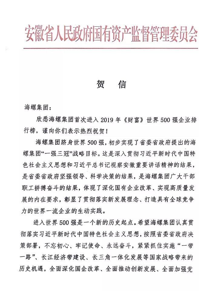 安徽省人民政府網、安徽日報、人民網安徽、中新社安徽、中安在線等主流媒體紛紛發(fā)布海螺進入世界500強消息報道。安徽省國資委專門向海螺集團致賀信。