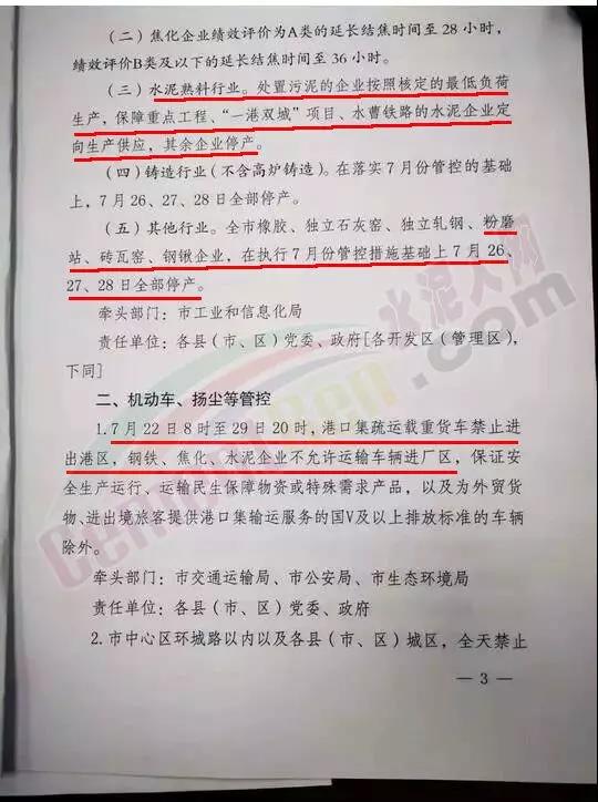 處置污泥的企業(yè)按照核定的最低負(fù)荷生產(chǎn),保障重點(diǎn)工程、“一港雙城”項(xiàng)目、水曹鐵路的水泥企業(yè)定向生產(chǎn)供應(yīng),其余企業(yè)停產(chǎn);他行業(yè)。全市粉磨站、磚瓦窯、鋼鍬等企業(yè),在執(zhí)行7月份管控措施基礎(chǔ)上7月26、27、28日全部停產(chǎn)。