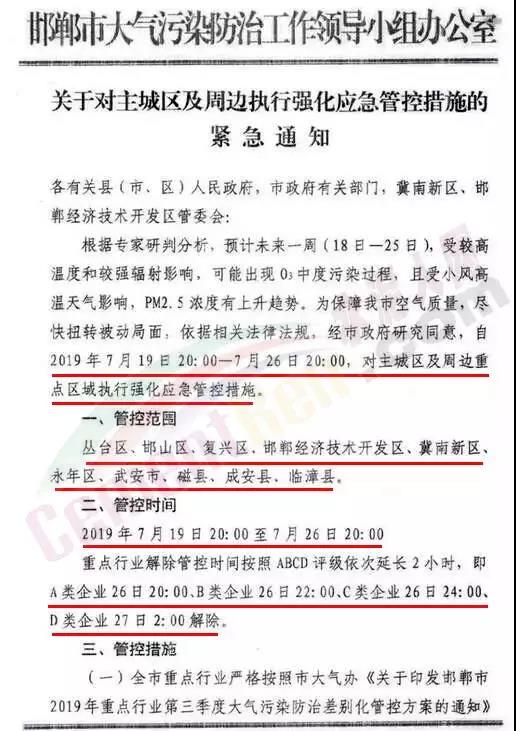 同期,邯鄲市大氣污染防治工作領(lǐng)導(dǎo)小組辦公室也發(fā)布了緊急通知,邯鄲市于2019年7月19日20.00-7月26日20:00,對主城區(qū)及周邊執(zhí)行大氣污染防治強(qiáng)化應(yīng)急管控措施。管控地區(qū)包括邯山區(qū)、復(fù)興區(qū)、邯都經(jīng)濟(jì)技術(shù)開發(fā)區(qū)、冀南新區(qū)、永年區(qū)、武安市、磁縣、成安縣、臨潭縣。