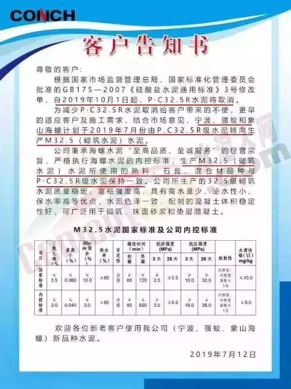 此前,浙江區(qū)域海螺水泥發(fā)布客戶告知書稱根據(jù)國(guó)家市場(chǎng)監(jiān)管總局、國(guó)家標(biāo)委會(huì)批準(zhǔn)GB175-2007《硅酸鹽水泥通用標(biāo)準(zhǔn)》3號(hào)修改單,自2019年10月1日起,P.C32.5R水泥將取消。