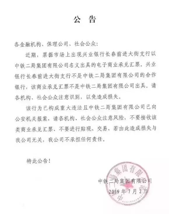 不久前中鐵二局也曾發(fā)布類(lèi)似的通知稱(chēng)票據(jù)市場(chǎng)上出現(xiàn)興業(yè)銀行長(zhǎng)春前進(jìn)大街支行以中鐵二局集團(tuán)有限公司名義出具的電子商業(yè)承兌匯票,興業(yè)銀行長(zhǎng)春前進(jìn)大街支行不是中鐵二局集團(tuán)有限公司的合作銀行,該商業(yè)承兌匯票不是中鐵二局集團(tuán)有限公司出具。