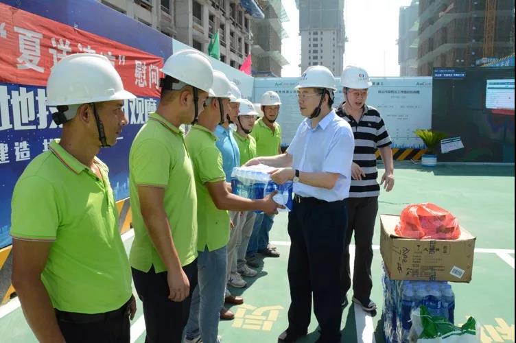 國(guó)貿(mào)集團(tuán)黨委書記、董事長(zhǎng)范陽向現(xiàn)場(chǎng)施工人員贈(zèng)送了仁丹、綠豆等防暑降溫用品。
