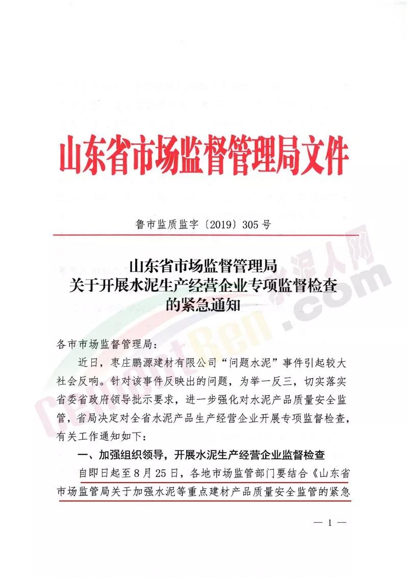 據(jù)水泥人網(wǎng)了解,山東各地的通知源于2019年7月29日的一份通知。通知稱:自即日起至8月25日,各地市場監(jiān)管部門要結(jié)合《山東省市場監(jiān)管局關(guān)于加強(qiáng)水泥等重點(diǎn)建材產(chǎn)品質(zhì)量安全監(jiān)管的緊急通知》(局函(2019)240號)要求,加強(qiáng)領(lǐng)導(dǎo),組織力量對轄區(qū)內(nèi)全部水泥產(chǎn)品獲證企業(yè)開展一次專項(xiàng)監(jiān)督檢查。