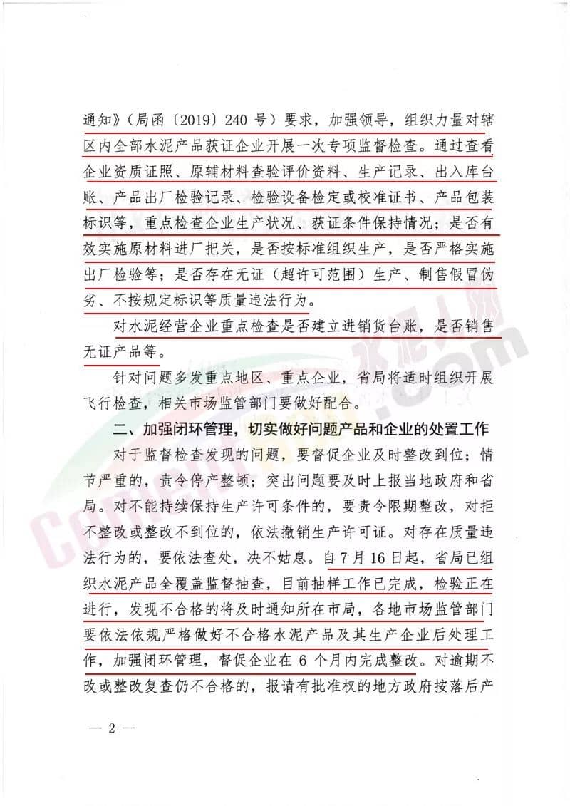 自7月16日起,省局已組織水泥產(chǎn)品全覆蓋監(jiān)督抽查,目前抽樣工作已完成,檢驗(yàn)正進(jìn)行,發(fā)現(xiàn)不合格的將及時通知所在市局,各地市場監(jiān)管部門要依法依規(guī)嚴(yán)格做好不合格水泥產(chǎn)品及其生產(chǎn)企業(yè)后處理工作,加強(qiáng)閉環(huán)管理,督促企業(yè)在6個月內(nèi)完成整改。