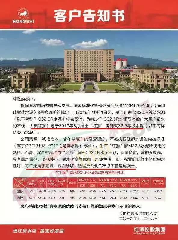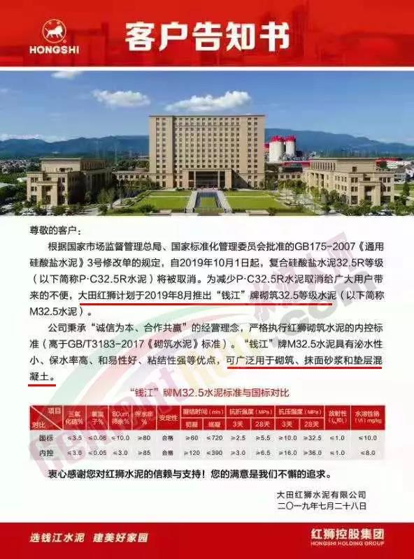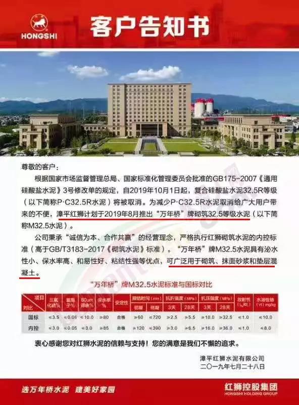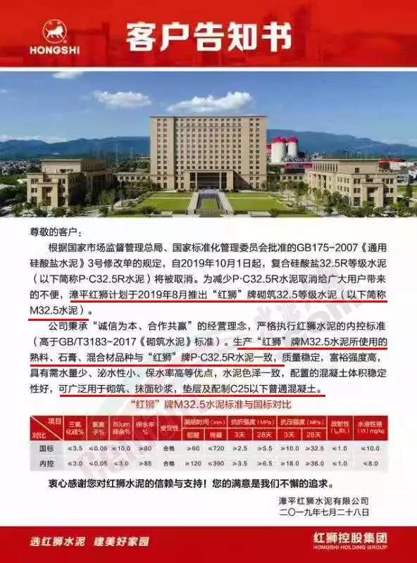 紅獅水泥福建區(qū)域大田紅獅和漳平紅獅等發(fā)布客戶告知書稱將于近期推出“紅獅”“錢江”、“萬年橋”品牌M32.5水泥。其中“紅獅”牌M32.5所使用的熟料、石膏、混合材品種與“紅獅”牌PC32.5R水泥一致。