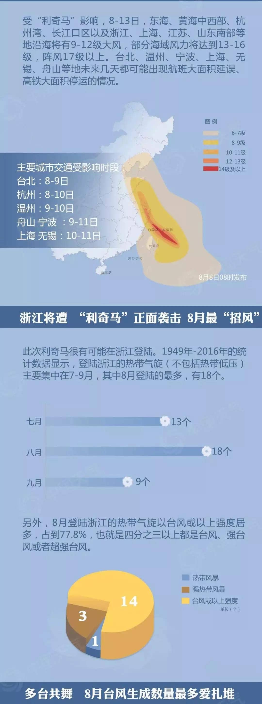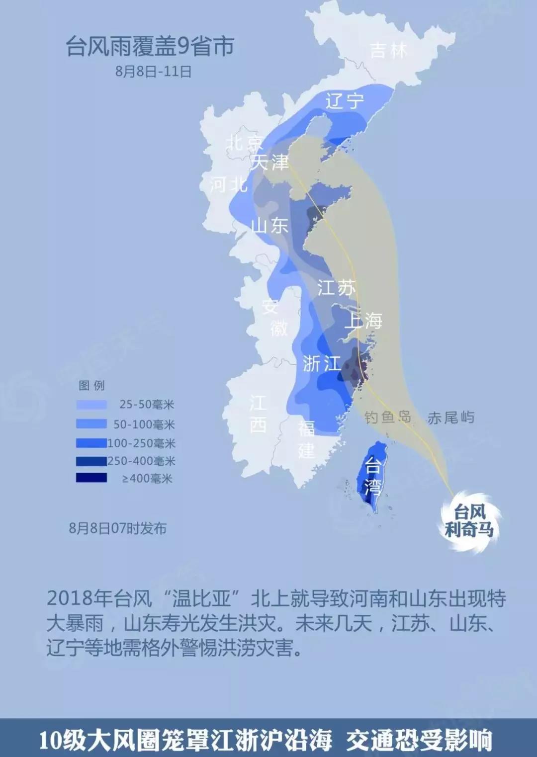 風雨強度大——8日至13日,東海、黃海中西部、杭州灣、長江口區(qū)以及浙江、上海、江蘇、山東南部等地沿海將有9至12級大風,部分海域風力將達到13至16級,陣風17級以上。8日至11日,臺灣島、浙江中東部、上海、江蘇東部、山東東部、遼東半島等地將有大暴雨,臺灣島中部、浙江東部等地局地特大暴雨,浙江東部累計降雨量300至500毫米,臺灣島中部達500至700毫米。