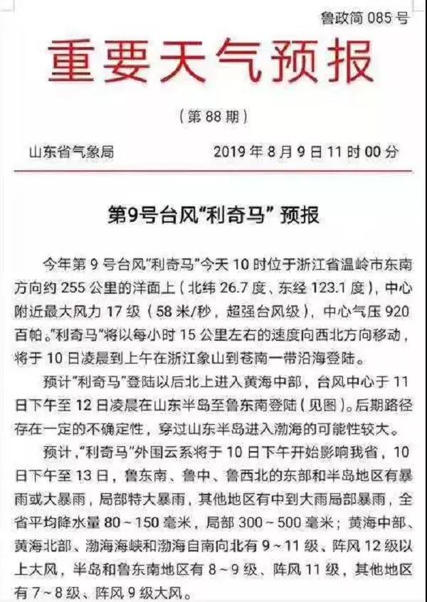 山東省氣象局發(fā)布第9號臺風“利奇馬”預報稱,預計臺風中心于11日下午至12日凌晨在山東半島至魯東南登陸。后期路徑存在一定的不確定性,穿過山東半島進入渤海的可能性較大。預計“利奇馬”外圍 云“系于10日下午開始影響山東省。