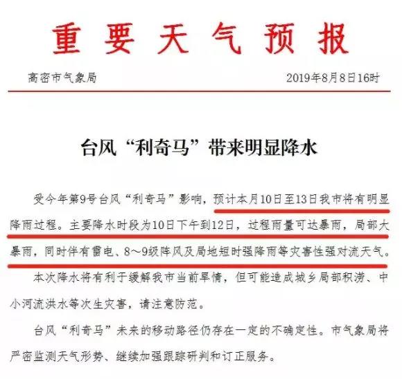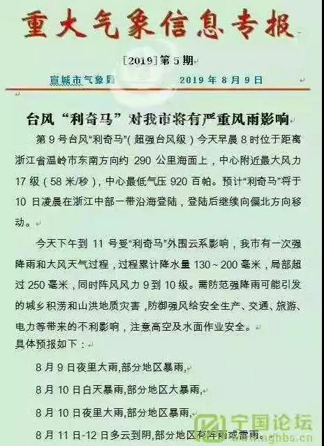 8月9日宣城市氣象局發(fā)布重大氣象信息專報稱,第9號臺風“利奇馬”(超強臺風)今天早晨8時位于距離浙江省溫嶺市東南方向約290公里海面上,中心附近最大風力17級(58米/秒),中心最低氣壓920百帕。9日下午至11日受“利奇馬”外圍 云系影響,宣城市有一次強降雨和大風天氣過程。需防范強降雨可能引發(fā)的城鄉(xiāng)積澇和山洪地質(zhì)災害,防御強風給安全生產(chǎn)、交通、旅游、電力等帶來的不利影響,需注意高空及水面作用安全。