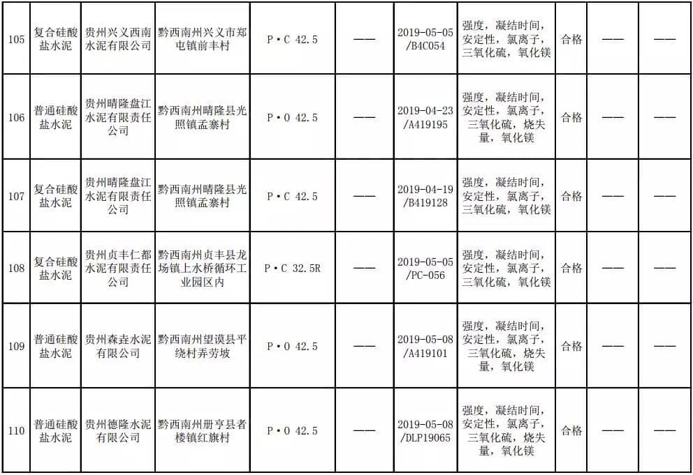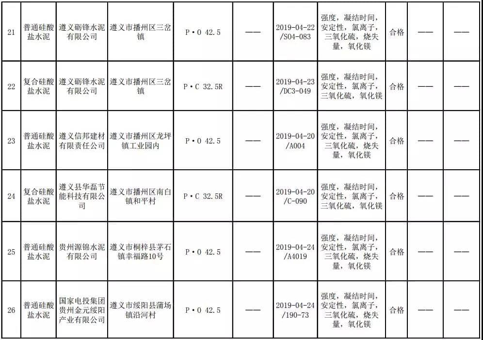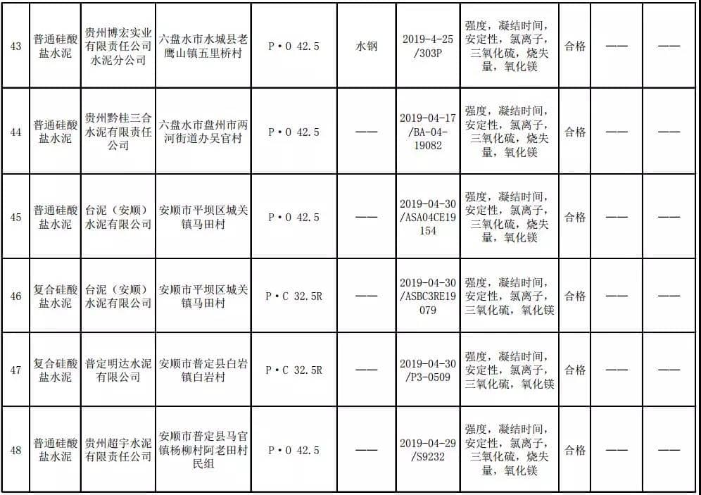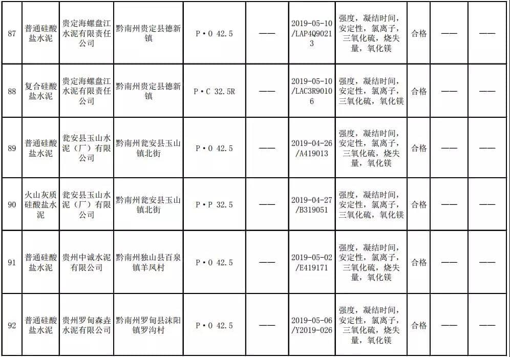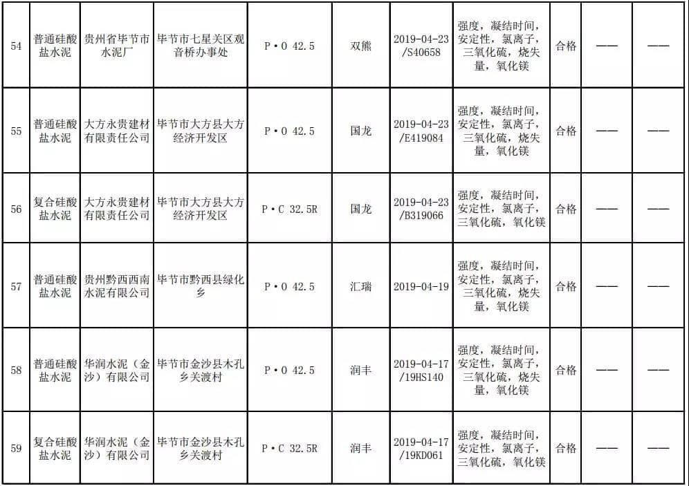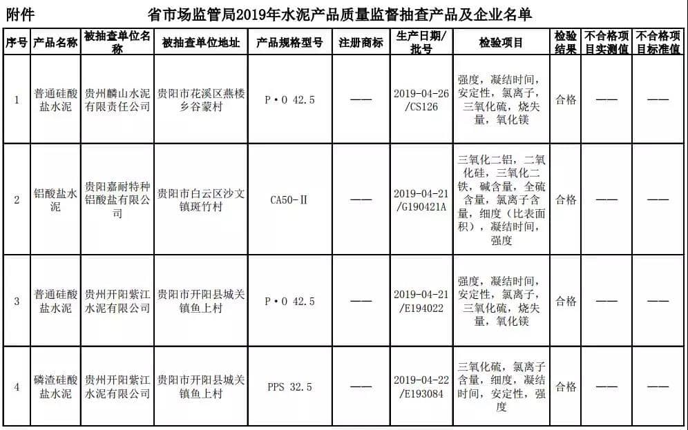 2019年8月13日,貴州省市場(chǎng)監(jiān)督管理局網(wǎng)站公布2019年水泥產(chǎn)品質(zhì)量監(jiān)督抽查結(jié)果。本次監(jiān)督抽查共抽查90家企業(yè)生產(chǎn)的112批次產(chǎn)品,抽查區(qū)域涉及貴陽(yáng)市、遵義市、六盤水市、安順市、畢節(jié)市、銅仁市、黔東南州、黔南州、黔西南州,產(chǎn)品檢驗(yàn)結(jié)果均為合格,問(wèn)題產(chǎn)品檢出率為0%,問(wèn)題企業(yè)發(fā)現(xiàn)率為0%。
